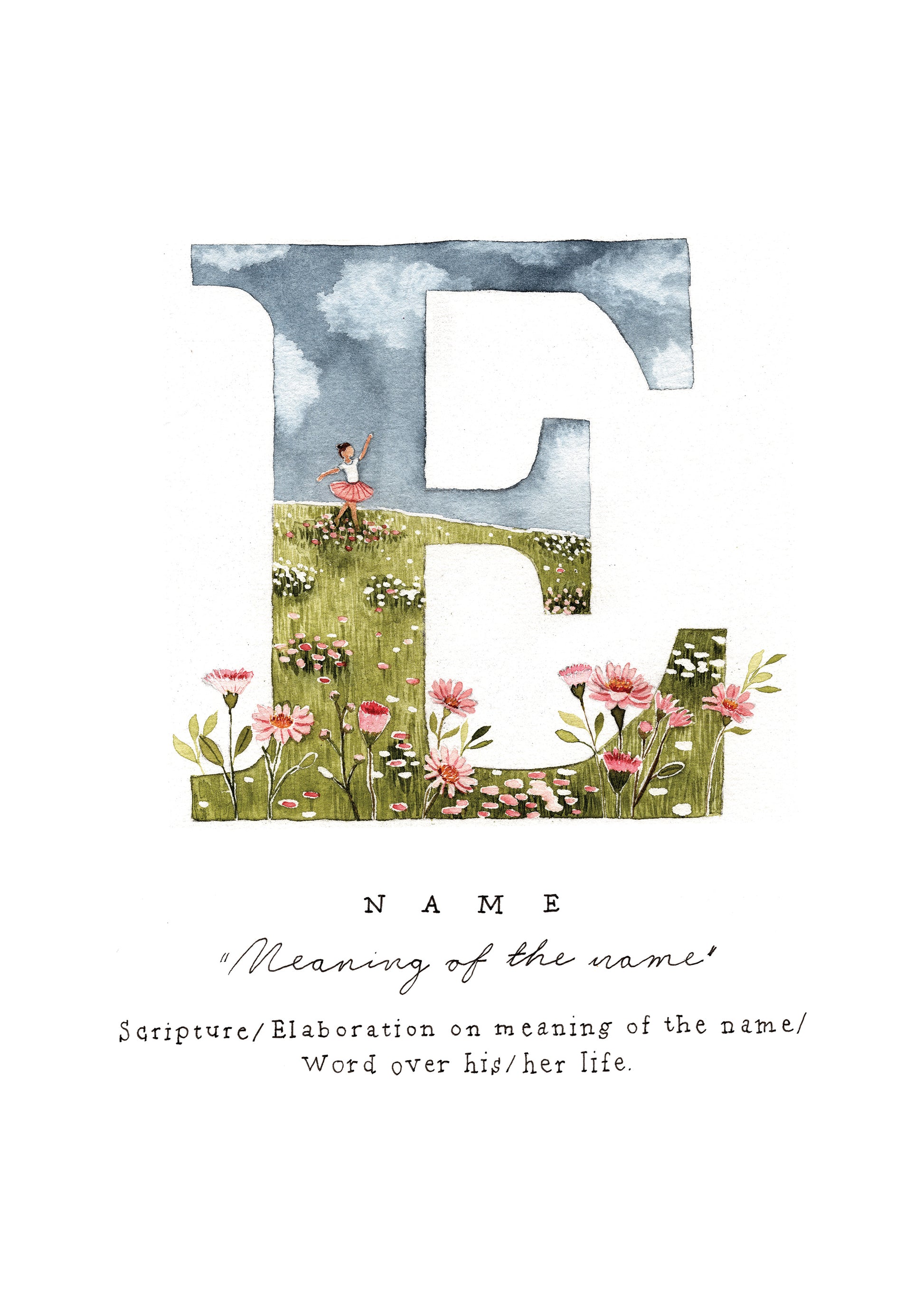 Please provide us with the name of the person. Additionally, if you would like to provide us with the meaning of the name or a special phrase, or a particular Bible verse, please do so here. Choosing to omit these details leaves this up to the artist’s discretion.