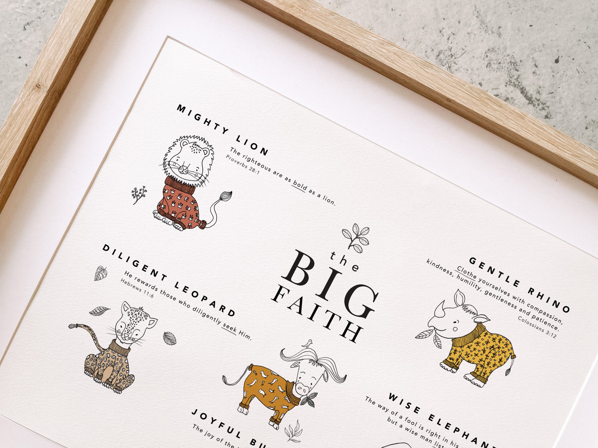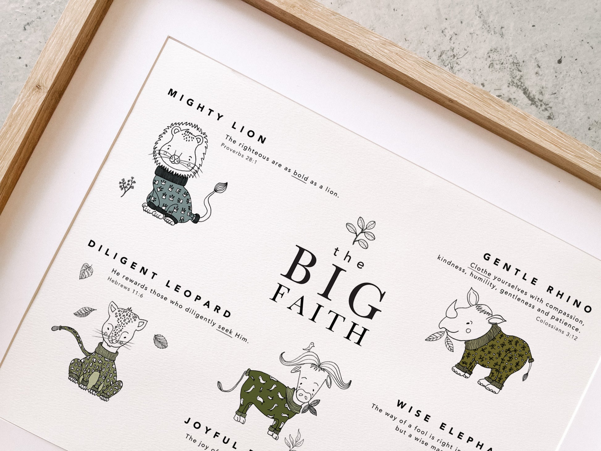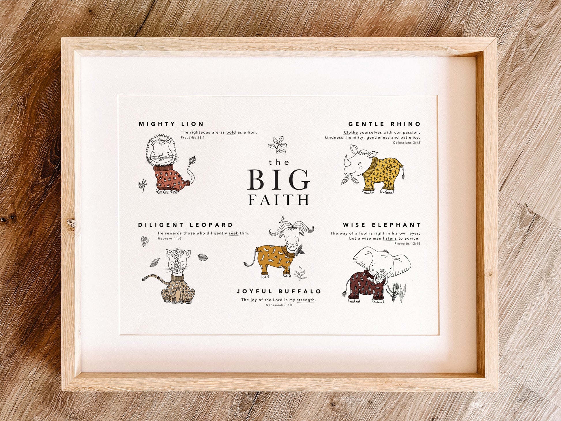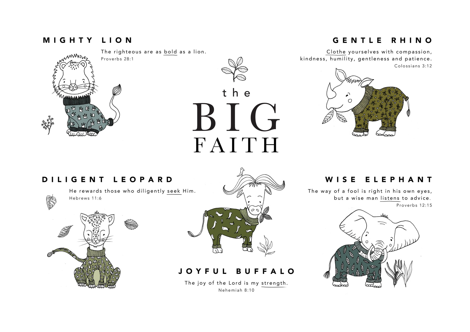 Step into the wild beauty of faith with The Big Faith, an artwork that aims to brings the majesty of Africa’s Big Five to life through the lens of God’s Word. Inspired by South Africa’s most iconic animals, this piece transforms them into powerful symbols of biblical virtues, creating a faith-filled journey for littles to embark on.